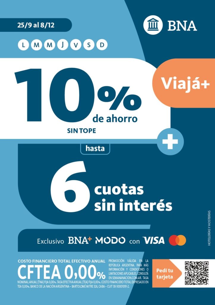 Promociones Las tarifas se visualizan directamente en la reserva.Reservas y Políticas de Pago:Medios de Pago:TransferenciaTarjeta de crédito en un pago12 cuotas sin interés abonando con MODO BNA+ (todo pago en destino).Horarios:Check-in: 13 hsCheck-out: 10 hsInformación adicional:Menores abonan a partir de los 3 años cumplidos.